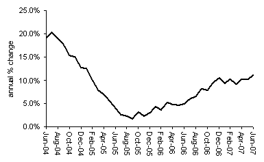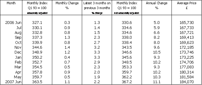 “While June’s heavy rain dampened the first days of Wimbledon, it did little to check the vigour of the housing market as house price inflation bounced back during the month. House prices increased by a stronger than expected 1.1% in June - the fastest monthly increase in 2007. The pick up during the month brings the annual rate of house price inflation to 11.1%, its highest level since January 2005 and more than twice as fast as the pace of growth at this time last year. The price of a typical house is now £184,070, more than £18,000 higher than this time last year, which is the equivalent of a rise of more than £50 per day.